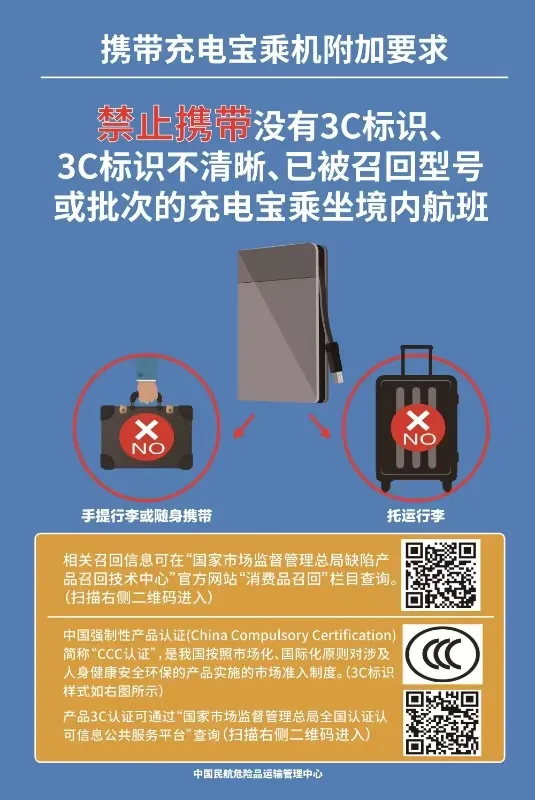 民航局发布紧急通知,自6月28日起禁止旅客携带没有3C标识、3C标识不清晰、被召回型号或批次的充电宝乘坐境内航班。